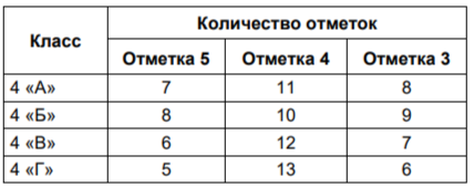 В школе подвели итоги годовой контрольной работы в 4-х классах. Все учащиеся выполняли работу и получили отметку 5, 4 или 3 (двоек не было). Количество полученных отметок за работу показано в таблице.