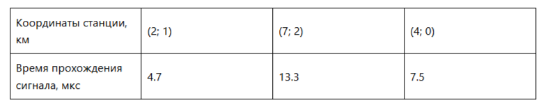 Определите координаты квадрокоптера. Ответ выразите в километрах, округлите до целых. При расчётах координат учитывайте возможную погрешность оборудования при измерении времени приёма сигнала — до 10 %.