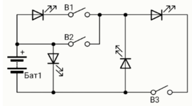 Задание 3. Катя собрала электронное устройство из батареи, кнопок и светодиодов по приведённой схеме. Какие светодиоды будут светиться, если нажаты все кнопки?