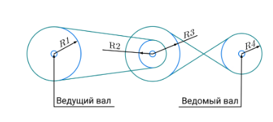 Задание 5. С помощью четырёх шкивов и двух ремней собрали двухступенчатую ремённую передачу.