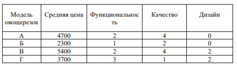 В таблице даны средняя цена и оценки каждого показателя для нескольких моделей овощерезок.