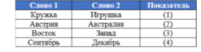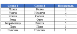 В компьютерной лингвистике широко применяется некий показатель, определённый для пар словоформ. Выше он вычислен для некоторых пар.