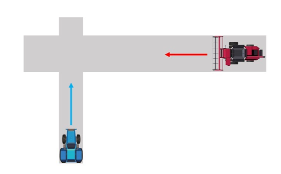 В момент t=0 с синий трактор движется со скоростью V1=6 м/с и находится на расстоянии S1=330 м от перекрёстка дорог, а красный комбайн движется со скоростью V2=12 м/с и находится на расстоянии S2=1500 м от перекрёстка. Размерами машин и шириной дороги пренебречь.