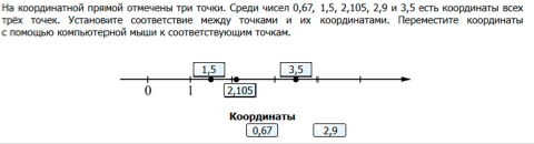 Задание 4. На координатной прямой отмечены три точки. Среди чисел 0,67, 1,5, 2,105, 2,9 и 3,5 есть координаты всех трёх точек. Установите соответствие между точками и их координатами. Переместите координаты с помощью компьютерной мыши к соответствующим точкам.