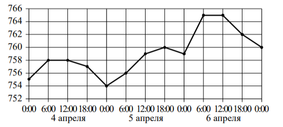 Задание 7. На рисунке точками показано атмосферное давление в некотором городе на протяжении трёх суток с 4 по 6 апреля 2013 года. В течение суток давление измеряется 4 раза: в 00:00, в 06:00, в 12:00 и в 18:00.По горизонтали указываются время и дата, по вертикали — давление в миллиметрах ртутного столба. Для наглядности точки соединены ломаной линией.