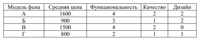 В таблице даны цены и показатели четырёх моделей фенов.