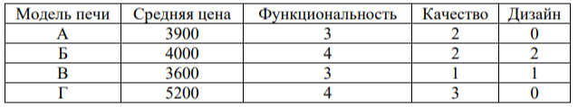 В таблице даны цены и показатели четырёх моделей микроволновых печей.