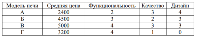 В таблице даны цены и показатели четырёх моделей микроволновых печей.
