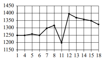 Задание 7. На рисунке показана цена акции компании на момент закрытия биржевых торгов во все рабочие дни в период с 1 по 18 июня 2012 года. По горизонтали указываются числа месяца, по вертикали — цена акции в рублях за штуку. Для наглядности точки соединены ломаной линией.