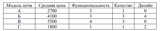 В таблице даны цены и показатели четырёх моделей микроволновых печей.