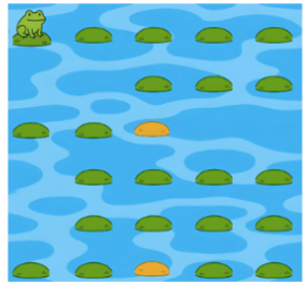 Задание 4. Путешествие лягушонка Среди туманного болота, где под утренним солнцем дрожат зелёные зеркала воды, жил лягушонок по имени Тимо. Он был известен своей неугомонной любознательностью и мечтал увидеть, что скрывается на самом краю болота — там, где последняя кочка уходит под старый корень и начинается суша. Кочки разбросаны по болотцу неровно — всё болото словно разделено на множество маленьких ячеек. В одних блестит вода, в других прячутся плотные кочки. Лягушонок может стоять только на кочках и прыгать с одной на другую — вниз или вправо. Иногда он делает короткий прыжок в соседнюю ячейку, а иногда — перепрыгивает через одну, будь то вода или кочка. Главное, чтобы приземлиться он всегда мог на надёжную кочку.