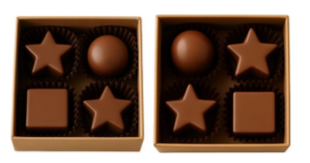 Задание 1. Конфеты. София подготовила конфеты для подарка маме: часть из них в форме звезды, часть — круглые, а часть — квадратные. Она хочет выбрать четыре конфеты и разложить их в коробку 2×2. Каждая ячейка имеет своё положение (верхняя левая, верхняя правая и т. д.), поэтому разные расположения считаются разными, даже если коробку повернуть.
