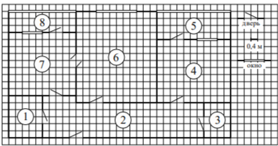 На рисунке изображён план двухкомнатной квартиры в многоэтажном жилом доме. Сторона одной клетки на плане соответствует 0,4 м, а условные обозначения двери и окна приведены в правой части рисунка. Вход в квартиру находится в коридоре. Слева от входа в квартиру находится санузел, а в противоположном конце коридора — дверь в кладовую. Рядом с кладовой находится спальня, из которой можно пройти на одну из застеклённых лоджий. Самое большое по площади помещение — гостиная, откуда можно попасть в коридор и на кухню. Из кухни также можно попасть на застеклённую лоджию.