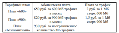 Задание 5.В квартире планируется подключить интернет. Предполагается, что трафик составит 700 Мб в месяц, и исходя из этого выбирается наиболее дешёвый вариант. Интернет-провайдер предлагает три тарифных плана.