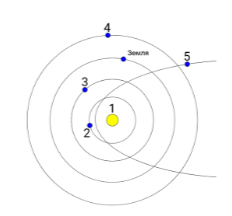 Задание 1. В одной далёкой планетной системе вокруг местного солнца Сола вращается 5 планет, орбиты которых лежат в одной плоскости. Местные жители живут на третьей от солнца планете Зема, похожей на нашу Землю по всем параметрам. Все планеты видны с Земы невооружённым глазом.