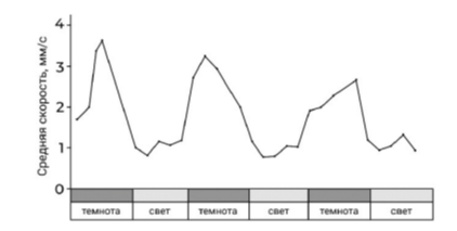 Задание 2. Проанализируйте график зависимости средней скорости движения мальков рыбок от освещённости. Чередующиеся периоды освещённости и темноты указаны на графике