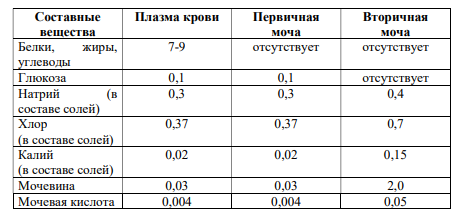 Задание 2. Проанализируйте таблицу «Сравнительный состав плазмы крови, первичной и вторичной мочи в организме человека».