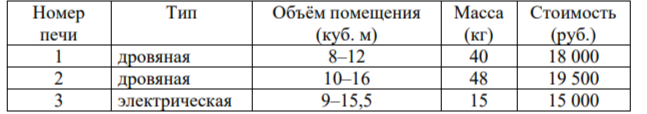 Хозяин дачного участка строит баню с парным отделением. Парное отделение имеет следующие размеры: длина — 3,5 м, ширина — 2,2 м, высота — 2 м. Окон в парном отделении нет, для доступа внутрь планируется дверь шириной 60 см, высота дверного проёма равна 1,8 м. Для прогрева парного отделения можно использовать электрическую или дровяную печь. В таблице представлены характеристики трёх печей.