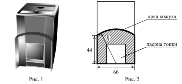 Печь снабжена кожухом вокруг дверцы топки. Верхняя часть кожуха выполнена в виде арки, приваренной к передней стенке печки по дуге окружности с центром в середине нижней части кожуха (рис. 2). Для установки печки хозяину понадобилось узнать радиус закругления арки R. Размеры кожуха в сантиметрах показаны на рисунке. Найдите радиус закругления арки в сантиметрах.