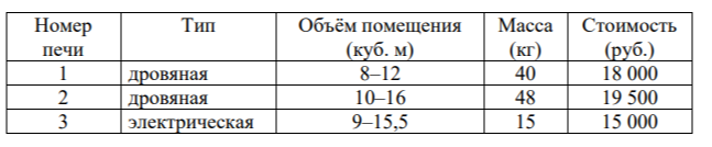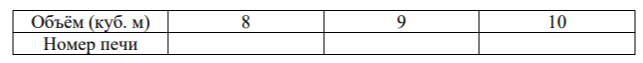 Задание 1. Установите соответствие между объёмами помещения и номерами печей, для которых данный объём является наименьшим для отопления помещений. Заполните таблицу, в бланк ответов перенесите последовательность трёх цифр без пробелов, запятых и других дополнительных символов.
