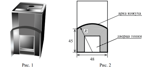 Печь снабжена кожухом вокруг дверцы топки. Верхняя часть кожуха выполнена в виде арки, приваренной к передней стенке печки по дуге окружности с центром в середине нижней части кожуха (рис. 2). Для установки печки хозяину понадобилось узнать радиус закругления арки R. Размеры кожуха в сантиметрах показаны на рисунке. Найдите радиус закругления арки в сантиметрах.