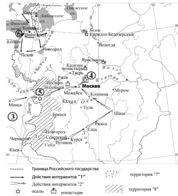 6) Территории, обозначенные в легенде схемы цифрой «7», были уступлены Россией по условиям Столбовского мира.
