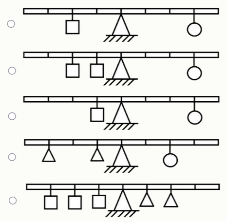 Задание 4. На метровую балку нанесли фломастером отметки на равном расстоянии друг от друга. Балку установили посередине на опору. В результате балка приняла горизонтальное положение. Масса шара 100 г, куба 100 г, пирамиды 200 г. Выберите два изображения, на которых балка находится в равновесии: