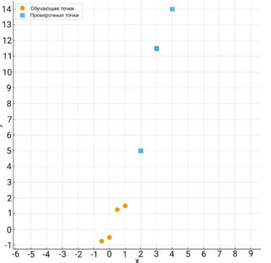 Обучающий: (−0.5;−0.75), (0;−0.5), (0.5;1.25),(1;1.5).
