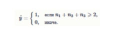 В каждой строке записаны четыре целых числа, каждое из которых равно 0 или 1: ответы трёх толстяков n1, n2, n3 и решение Тутти y. На основании мнений толстяков повар по правилу большинства делает предположение y^ о том, будет ли попробовано блюдо: если хотя бы два толстяка считают, что Тутти согласится (1), то повар тоже предполагает согласие (1), иначе — отказ (0):