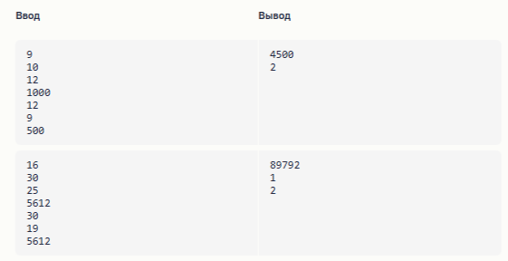 Даниилу необходимо отправить n студентов на олимпиаду в Саратов. Для этого доступны два автобусных рейса, каждый из которых характеризуется днём прибытия, количеством свободных мест и стоимостью билета. Студентов можно отправить только тем рейсом, в котором имеется не менее n свободных мест. Если подходящих рейсов несколько, следует выбрать рейс с наиболее поздним днём прибытия это позволит сэкономить на размещении в гостинице. Если после этого выбора остаётся более одного варианта (то есть оба рейса прибывают в один и тот же день и оба вмещают всех студентов), предпочтение отдаётся более дешёвому рейсу. Помогите Даниилу. Определите минимальную стоимость поездки, а также номера рейсов, которыми можно отправить студентов.