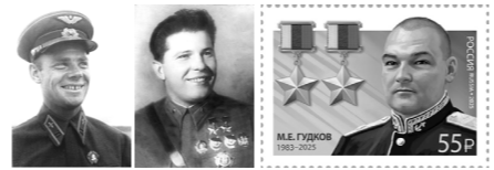 Задание 11. Генерал-майор Михаил Гудков, в честь которого выпущена почтовая марка, представленная ниже, стал первым дважды Героем Российской Федерации (обеих Золотых Звёзд генерал удостоен за участие в Специальной военной операции, второй Звездой награждён посмертно). А первые дважды Герои Советского Союза — лётчики Сергей Грицевец и Григорий Кравченко (на фото), вторично удостоенные звания за отличие в боях, состоявшихся ещё до Великой Отечественной войны. Участвовать и погибнуть в ней было суждено Кравченко, а жизнь Грицевца трагически оборвалась в том же году, когда они оба стали дважды Героями.