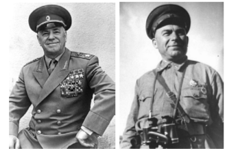 Генерал-лейтенант танковых войск В.М. Баданов (1895-1971, на фото справа) известен как первый кавалер ордена Суворова: в декабре 1942 г. он был награждён орденом Суворова II степени за проведение успешного рейда по вражеским тылам. А Маршал Советского Союза Г.К. Жуков (1896-1974, на фото слева) стал первым кавалером этого ордена I степени — в январе 1943 г. был удостоен его за координацию действий войск Волховского фронта при прорыве блокады Ленинграда.