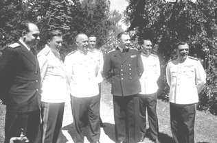 Задание 21. В 1943-1944 гг. этот советский военно-морской деятель командовал Беломорской военной флотилией, обеспечивая проводку союзных конвоев к северным портам СССР, а в 1945 г. принимал участие в Ялтинской и Потсдамской конференциях, возглавляя рабочую группу военно-морских советников (на снимке, сделанном в Потсдаме, он первый слева).