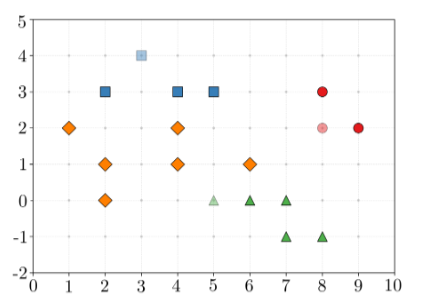 Задание 3. На плоскости даны 18 точек с целыми координатами. У каждой точки есть номер класса: 0, 1, 2 или 3.