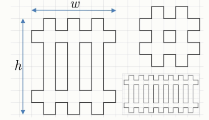 Задание 2. Забор Тимофей сидит на контрольной работе по математике и скучает, поскольку свою работу уже завершил и даже сдал на проверку. Но поскольку из класса раньше звонка никого не выпускают, мальчик решил на клетчатом листочке‑черновике нарисовать забор‑штакетник. Подготовленное юным художником изображение имеет размеры w клеточек в ширину (у такого забора горизонтальные направляющие называются лаги, их ровно две) и h клеточек в высоту (высота вертикальных досок). Поскольку между досками юный художник оставляет зазор шириной в одну клетку, w будет выражаться нечётным числом. На рисунке вы можете увидеть различные типы нарисованных Тимофеем заборов.