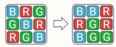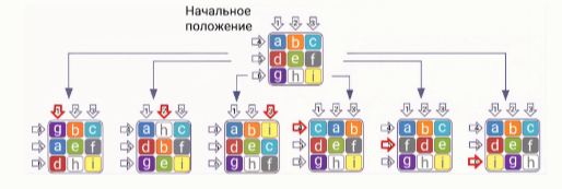 Задание 3. Кубик Рубика 2D (7-8). Тимофей разрабатывает свою первую компьютерную игру‑головоломку. Поскольку он только начал изучать программирование и пока боится браться за крупные и сложные проекты, было принято решение взять хорошо всем знакомый кубик Рубика и сделать его простую плоскую реализацию. На прямоугольном поле 3×3 расположены девять квадратных фишек трёх различных цветов и шесть кнопок, меняющих их расположение. Первая, вторая и третья кнопки циклически сдвигают левый, средний и правый вертикальные ряды соответственно на одну позицию вниз. Четвёртая, пятая и шестая кнопки также циклически сдвигают на одну позицию вправо верхний и нижний ряды фишек соответственно. Некоторая начальная позиция фишек (для наглядности в этом примере все фишки раскрашены в разные цвета) и их положение после нажатия кнопок показаны на рисунке.