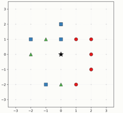 Новую точку (0,0), помеченную зведочкой, нужно отнести к одному из трех классов по правилу ближайшего центра, определим это правило далее.