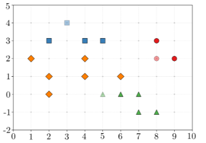 Задание 3. На плоскости даны 18 точек с целыми координатами. У каждой точки есть номер класса: 0, 1, 2 или 3.