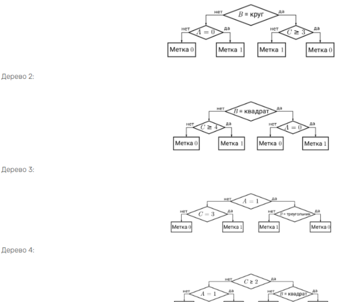 Задание 4. Даны четыре простых правила в виде «деревьев вопросов», которые в зависимости от различных признаков определяют для объекта метку 0 или 1.