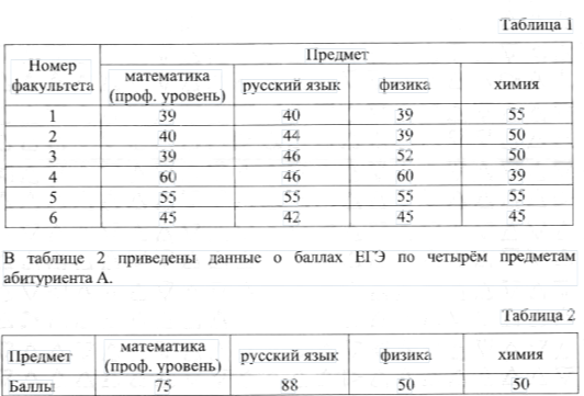 Задание 6. В таблице 1 приведены минимальные баллы ЕГЭ по четырём предметам, необходимые для подачи документов на факультеты 1-6.