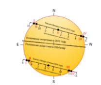 Буквами E и W обозначены направления на стороны света (восток и запад соответственно) с позиции земного наблюдателя, расположенного в Северном географическом полушарии, а буквами N и S —направления на северный и южный полюсы мира соответственно. Представлена шкала всемирного времени в часах. Римскими цифрами обозначены основные фазы транзита и соответствующие положения Венеры.