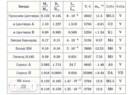 Примечание: здесь M∗, R∗, L∗ — значения массы, радиуса, светимости звезды соответственно, T∗ — эффективная температура её поверхности, m∗ — её видимая звездная величина; M⊙, R⊙, L⊙ — значения массы, радиуса, светимости Солнца соответственно; СпКл — спектральный класс звезды, КлСв — класс её светимости.