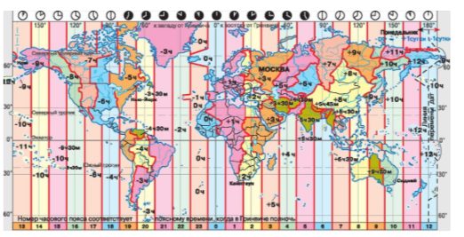 6. Дана карта мира с разбиением его территории на часовые пояса. Здесь арабскими цифрами со знаком указаны значения разности ΔT времени, определённого в данном и гринвичском часовых поясах. На нижней кромке карты указаны номера часовых поясов.