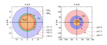 Также представлены в масштабе сферы сублимации для семи распространённых космических льдов Солнечной системы (H2O, CO, N2, CH4, CO2, NH3, O2) с указанием их значений минимальной температуры сублимации, достигаемой на поверхностях этих сфер.