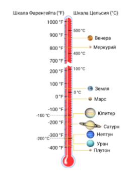 5. Дано символическое изображение термометра с указанием средних значений температур (по Цельсию и Фаренгейту) поверхностей классических и карликовой планет Солнечной системы.