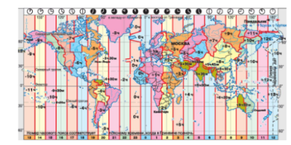 6. Дана карта мира с разбиением его территории на часовые пояса. Здесь большими жирными арабскими цифрами со знаком указаны значения разности ΔT времени, определённого в данном и гринвичском часовых поясах. На нижней кромке карты указаны номера часовых поясов.