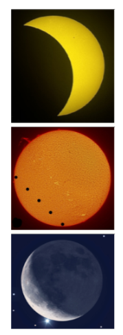 5. При сближении и, в конечном счёте, расположении на одной прямой (сизигии) двух небесных светил с позиции земного наблюдателя, расположенного в определённой точке поверхности Земли, возможны три различных астрономических события: покрытие, затмение или транзит (прохождение).