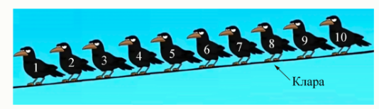 Клара сидит четвёртая по счёту. Определите номера остальных ворон.