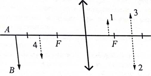 Задание 13. Какая из пунктирных стрелок (1, 2, 3 или 4) занимает место изображения сплошной стрелки АВ в тонкой собирающей линзе с фокусным расстоянием F?