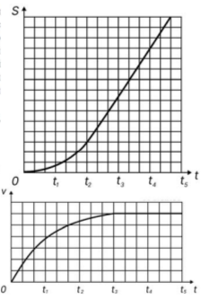 Задание 5. Желая повторить опыты Галилея учащиеся в безветренную погоду роняли с высокой башни шарик для настольного тенниса и снимали полет цифровой видеокамерой. Обработка видеозаписей позволила построить графики зависимости пути s, пройденного шариком, и модуля его скорости υ от времени падения t.